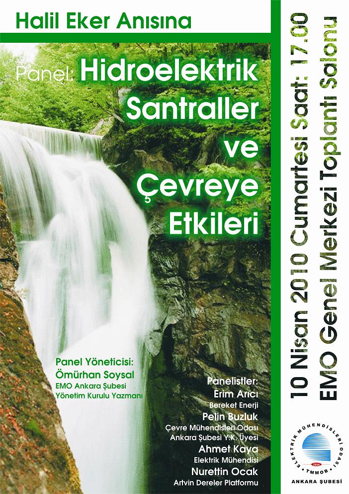 10 Nisan 2007 tarihinde aramızdan ayrılan EMO Ankara Şubesi 6. ve 7. Dönem Yönetim Kurulu Üyesi Halil Eker anısına “Hidroelektrik Santraller ve Çevreye Etkileri” konulu panel 10 Nisan 2010 Cumartesi günü EMO Genel Merkezi Toplantı Salonu’nda saat 17.00'de gerçekleştirilecektir. Yöneticiliğini EMO Ankara Şubesi Yönetim Kurulu Yazmanı Ömürhan Soysal'ın yapacağı panele Erim Arıcı (Bereket Enerji), Pelin Buzluk (ÇMO Ankara Şubesi), Ahmet Kaya (Elektrik Mühendisi) ve Nurettin Ocak (Artvin Dereler Platformu) konuşmacı olarak katılacaklar. Aynı gün saat 12.00'de EMO Ankara Şubesi önünden araç kaldırılacak ve Halil Eker, Karşıyaka Mezarlığı'nda kabri başında anılacak.Tarih: 10 Nisan 2010